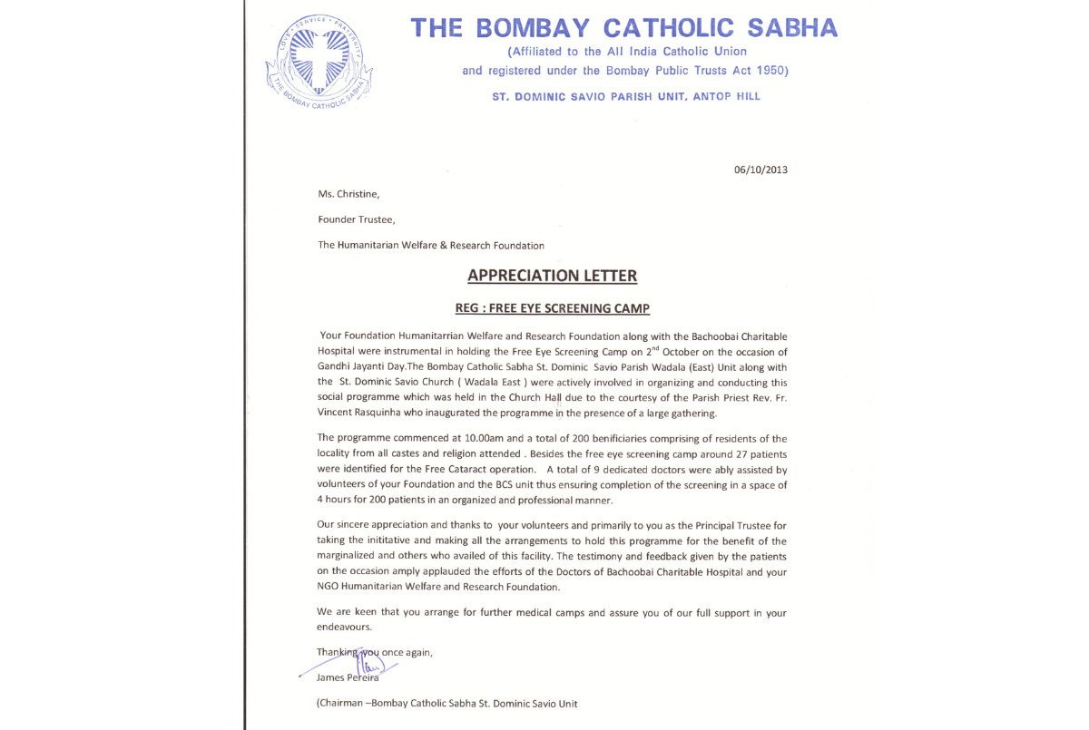 Appreciation Letter Received from Conducting The Bachoobai Charitable Hospital Were instrumental in Holding The Free Eye Screening Camp at The Bombay Catholic Sabha st. Dominic Savio Parish Wadala (E)