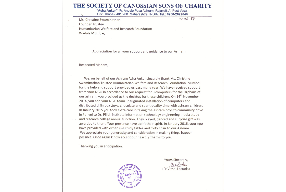 Appreciation Letter Received from The Society of Canossion Sons of Charity For Conducting 8 Computer of The Orphans of Our Ashram inaugurated installation of Computer And Distributed Tiffin Box, Chocolate And Spent quality Time with Ashram Children at Vasai